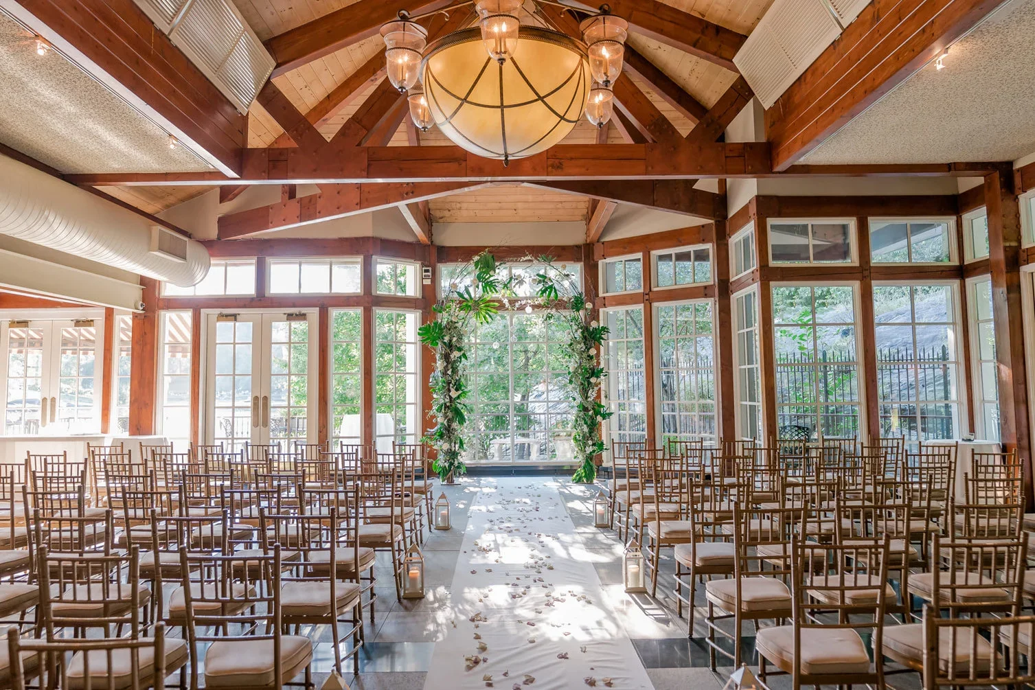 Vibe: Prospect Park Boathouse is a landmark Brooklyn wedding venue featuring lakeside views and romantic event spaces. Just look at the natural light at golden hour through these windows!